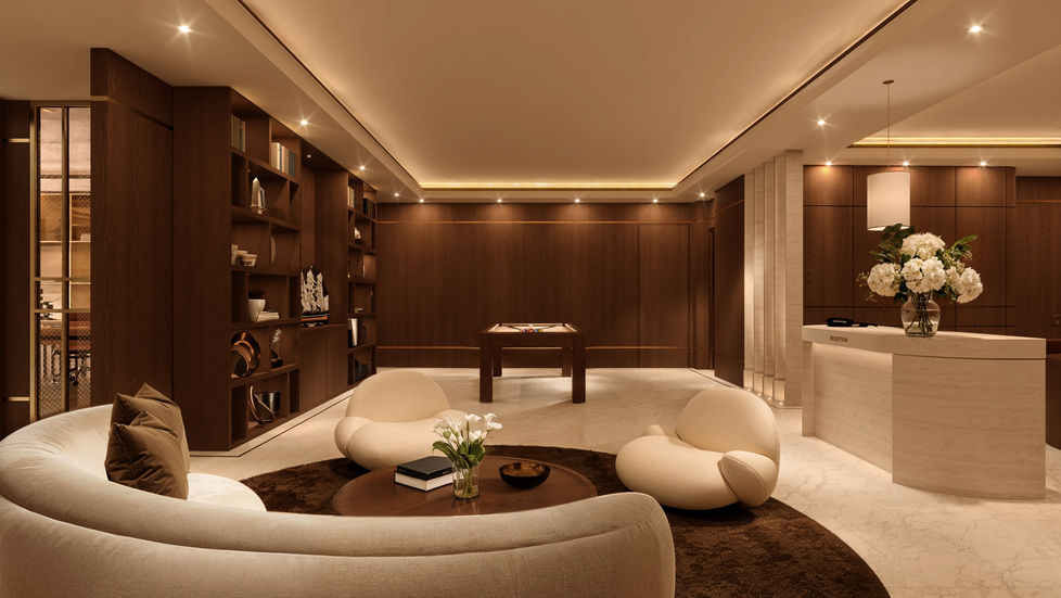 To the right, the reception desk stands out in creamy marble with gentle curves that echo the furniture. Behind it, a tall floral arrangement of lush white blooms softens the scene and introduces an air of understated grandeur. Overhead, soft cove lighting illuminates the ceiling, casting a golden glow and enhancing the sense of calm luxury. The floors, polished in light marble, provide balance to the deep wood tones, reflecting light throughout the room.