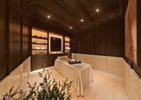 This serene treatment room redefines luxury and tranquility, seamlessly blending spa-like comfort with high-end design. The walls and ceiling are clad in curved, warm oak wood panels that envelop the space, creating a cocooning effect that feels both intimate and elegant. A soft travertine wainscot wraps the lower portion of the room, introducing a subtle texture contrast and reinforcing the organic, earthy palette.