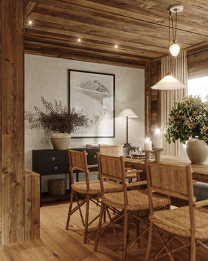 At the heart of the space, a sculptural fireplace with a dark steel hood flickers quietly, its gentle glow reflected in the subtle textures of linen upholstery and the softly burnished floorboards. A thoughtfully placed dining table is surrounded by natural-fiber chairs, artisan ceramics, and a hint of greenery, each detail curated to evoke a harmonious balance of rustic elegance and modern sophistication. It is a place where one can linger over candlelight, a glass of wine, and the soft hush of the winter landscape beyond.